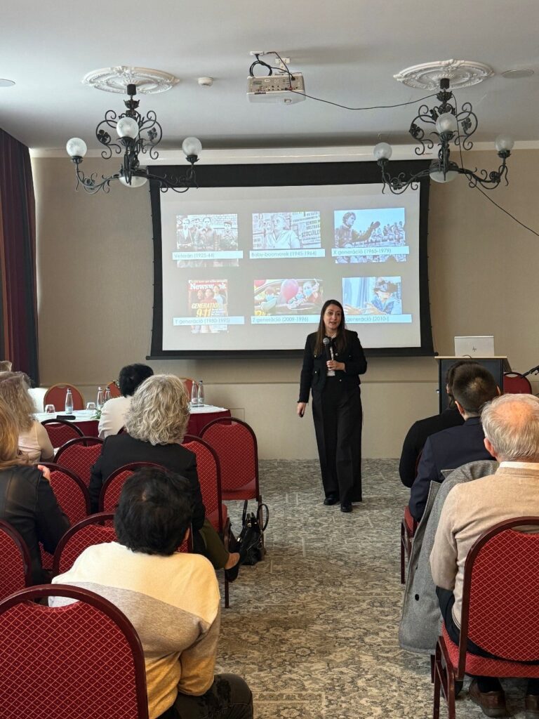 Előadásában bemutatta a különböző generációkat – a veterán, baby boomer, X, Y, Z és alfa generációt –, valamint a köztük lévő kommunikációs különbségeket. Kiemelte, hogy a Z generáció körében már 81% használt valamilyen AI-eszközt egészségügyi döntések támogatására, ezért a hiteles szakmai kommunikáció az online térben egyre fontosabbá válik.